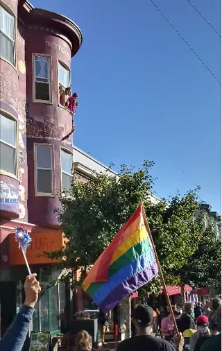 By 1pm, a bus with a DJ booth got hundreds, then more than 1,000 celebrants -all wearing facemasks- dancing on Castro Street as others enjoyed food and drinks at outdoor parklets outside bars and restaurants. In between music, celebrants listened to impassioned speeches by Sister Roma, Alex U Inn and others. They also listened to a live audio feed of both Biden and Harris' speeches from the rally in Wilmington, Delaware.